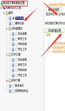 2、发布新闻时,除选择文章原始位置《学院新闻》或《通知公告》栏目外,