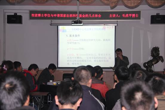 毛虎平博士首先介绍了自己在华中科技大学CAD中心的求学经历和攻读博士学位的体会,强调保持求知欲是研究生和博士阶段做好科学研究、取得高水平成果的必备条件;然后,毛虎平博士分享了自己成功申报国家自然科学基金的经验,指出课题题目要新颖、内容要具体和集中、技术路线具有可操作性等是申报科研项目成功的几个关键点。