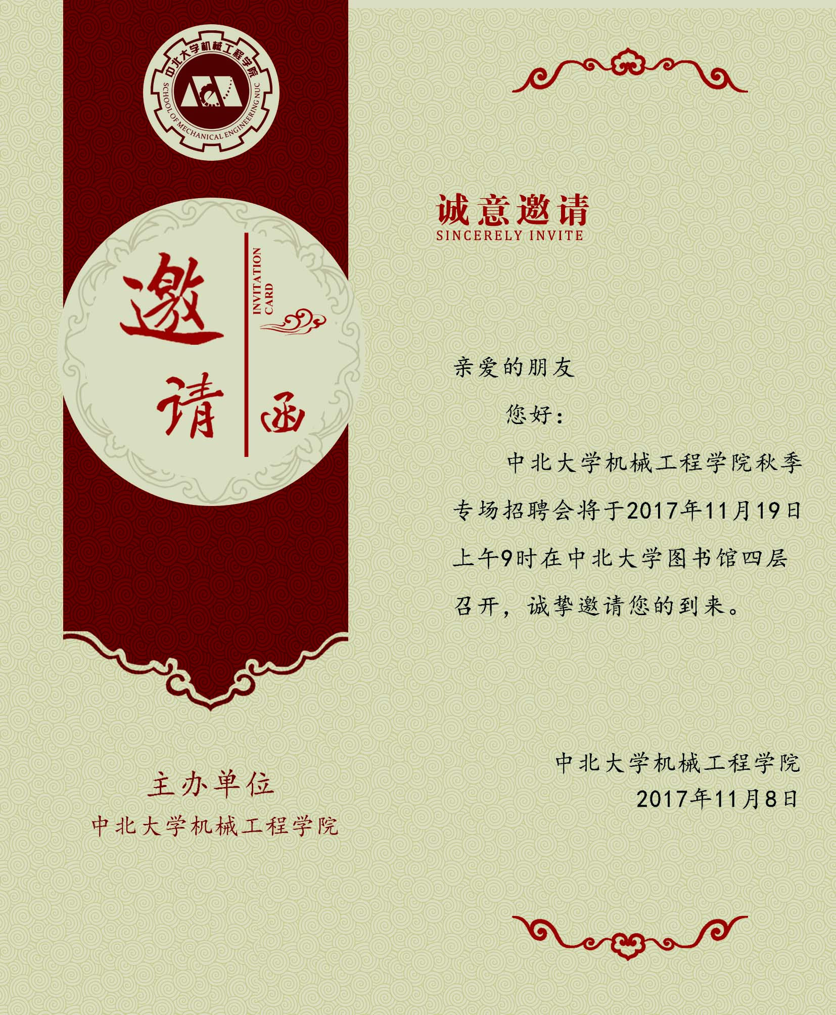 中北大学机械工程学院2018届毕业生机械专场招聘会将于2017年11月19日举办。请有意向参加我院机械专场的用人单位于2017年11月13日前将“回执函”填好后、和企业的资质材料(营业执照副本和组织机构代码证)、企业简介、招聘简章等材料的扫描件或电子版发送至邮箱59859511@qq.com,以便我处提前安排展位。如有疑问可致电0351-3920280。