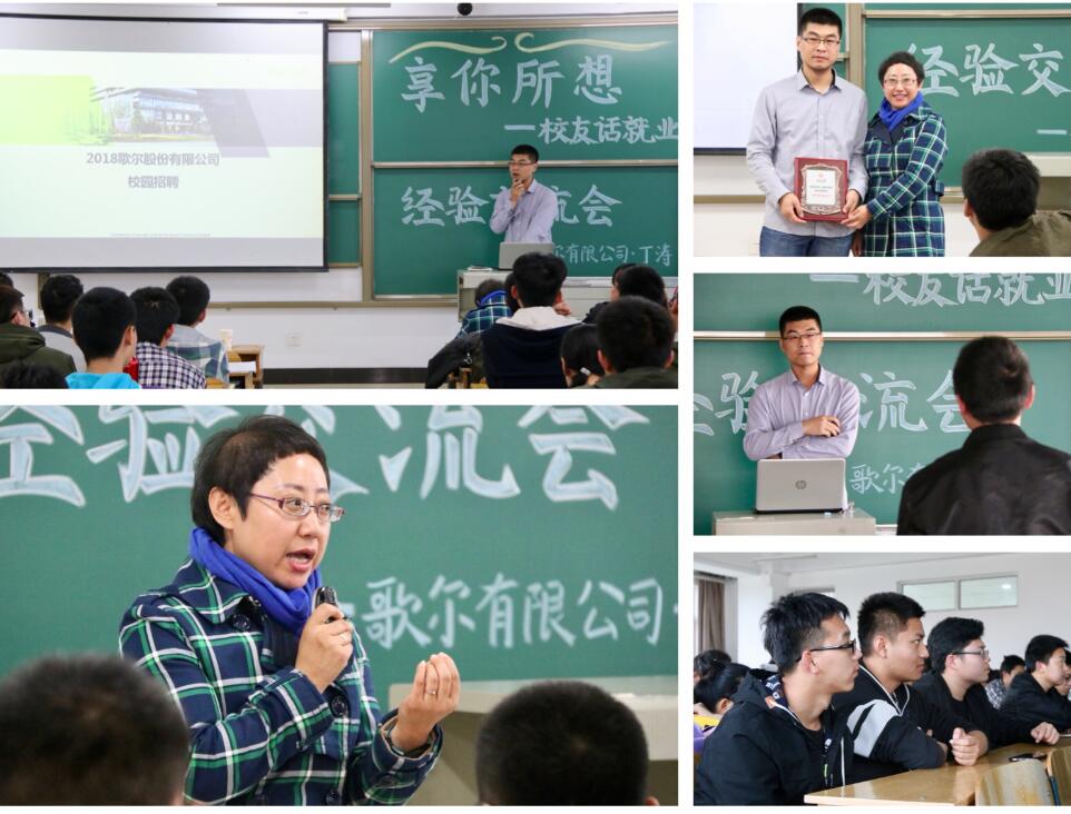活动伊始,院党委副书记李秀玲老师为丁涛校友颁发了校友讲师团特聘讲师证书,并为本次活动做宣讲前的发言。活动中,歌尔股份有限公司目管理部负责人丁涛校友结合十余年的学习、创业和就业经历向学生们分享了他一路走来的酸甜苦辣与人生感悟。他指出:大学生应当在大学阶段打好地基,努力学习专业知识,具备扎实的专业功底,并进行未来职业规划,同时也要积极参加校内外各种活动,提高实践能力,提前完成从大学到社会阶段的过渡。同时,他为同学们简要介绍了歌尔股份有限公司的发展历程,规模及所取得的成就,他表示付出与收获总是成正比,学生们可以适当借鉴他人的经验,促进自身成长。最后在互动环节,同学们踊跃发言,就所关心的包括专业就业方向,职业生涯规划等方面的问题提出疑问,丁涛校友结合自身经历热情地回答了他们的问题,让学生们受益匪浅。